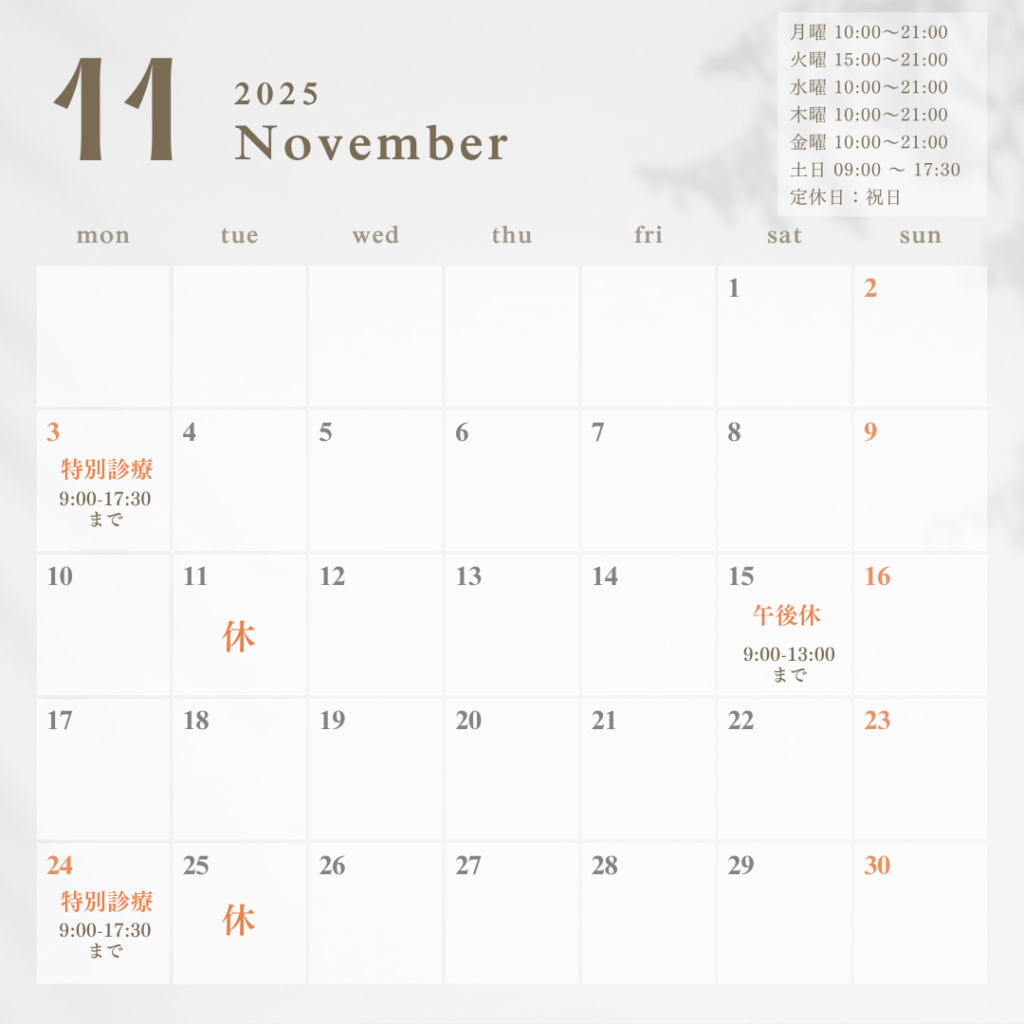 | 11月24日(月・祝) | 特別診療(9:00〜17:30) |