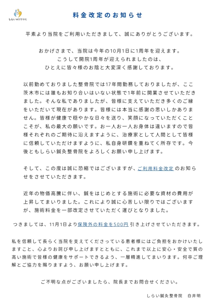 お知らせ2025年9月27日【重要】施術料金改定のお知らせ(2025年11月より)
